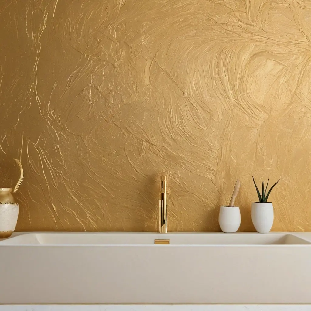 Золотистая слюда отлично вписывается в арт-деко и модерн, где игра блеска и геометрических форм сочетается с роскошной отделкой. Нанесение штукатурки с этим эффектом на изголовье кровати или зеркальных панелях задаёт настроение всей комнате.